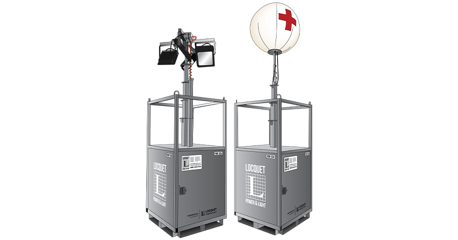 Mât d’éclairage stationnaire avec générateur interne. Équipé de projecteurs LED flexibles pour éclairage à 360°.