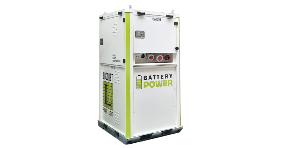 Système de batteries Powerbooster conçu pour absorber les pics de puissance, alternative au générateur diesel sur chantier.